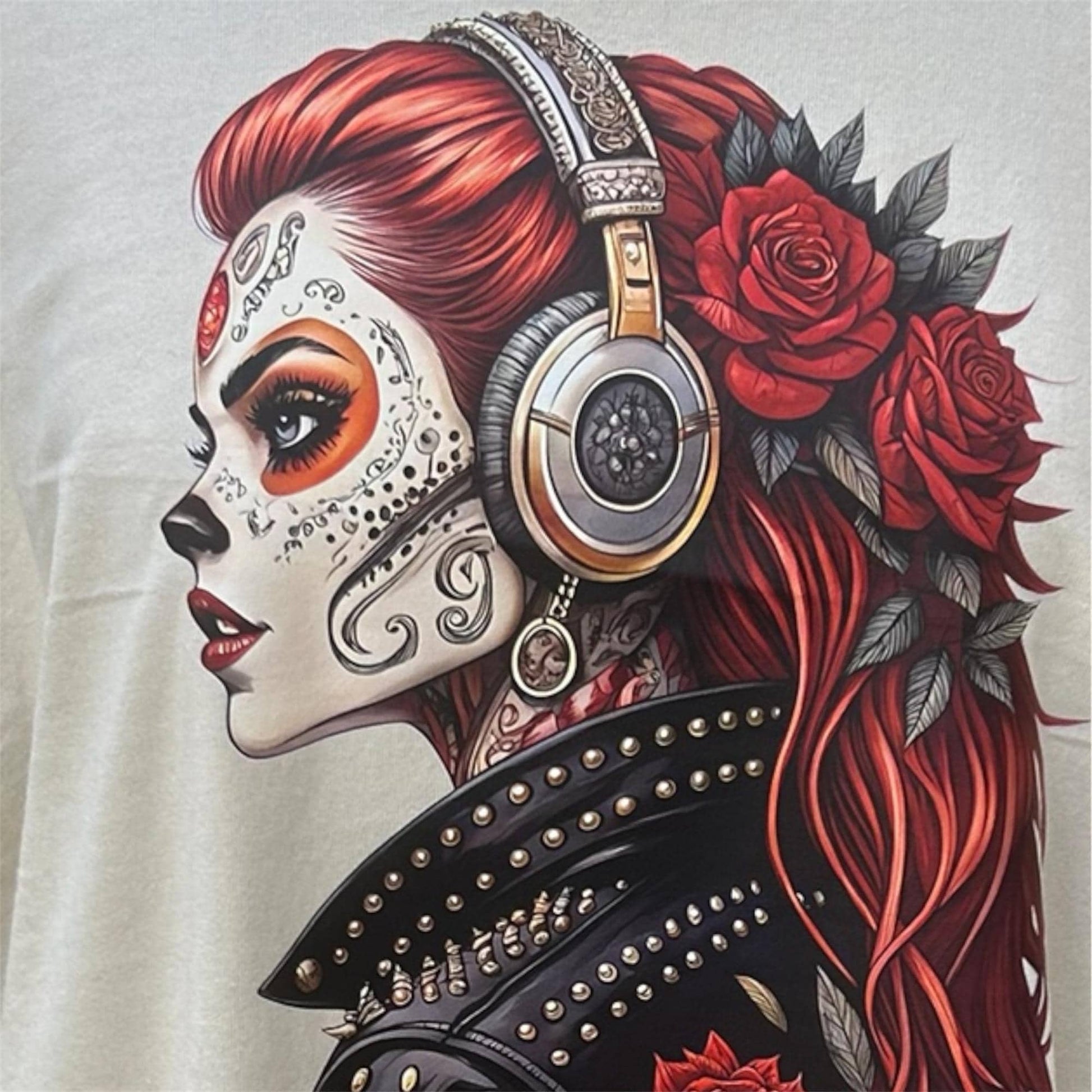 Featuring a striking graphic of a fierce rock chick adorned with sugar skull makeup and edgy style, this tee fuses Día de los Muertos artistry with pure rock 'n' roll attitude.